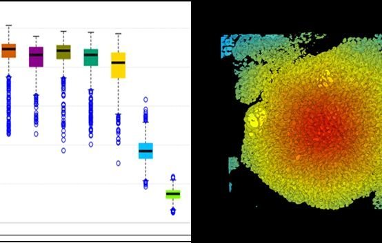 Analysis results appear as data tables and plots that can be browsed on-screen by scrolling, panning, and zooming. Results of many analyses can also be shown as 2D or 3D heatmaps mapped onto image data, fully compatible with all visualization options in daime.